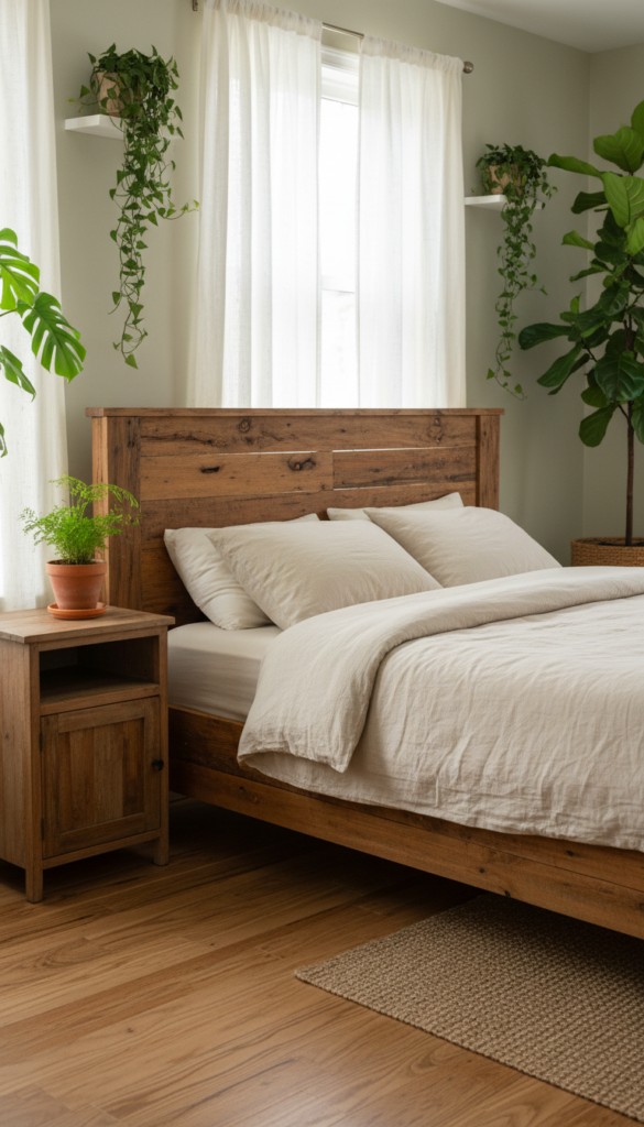 The key to achieving the Urban Jungle look is to balance the vibrancy of plants with natural materials. Wood furniture—whether it’s a reclaimed wood bed frame, a rustic nightstand, or a vintage dresser—helps ground the space and creates a harmonious connection with nature. The rich tones of the wood will complement your greenery, creating a serene and earthy atmosphere.