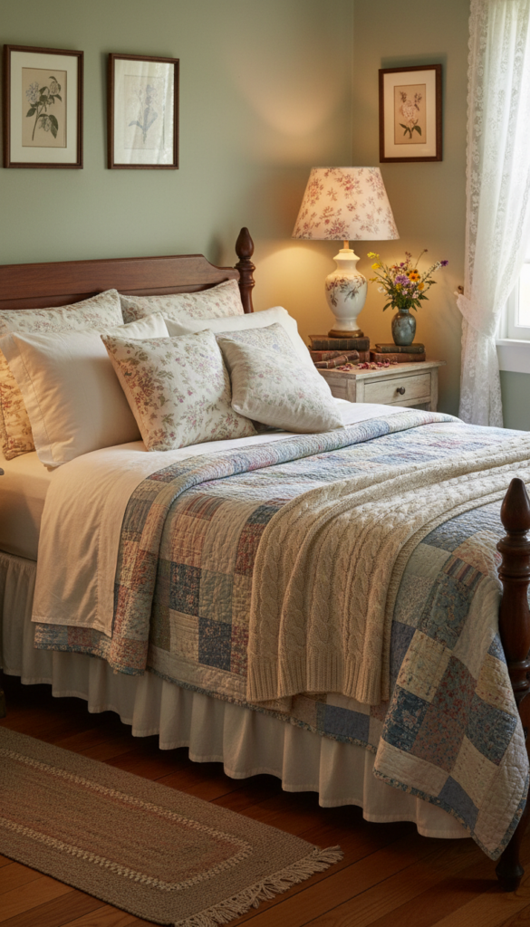 A vintage bed is never perfectly smooth; it is layered and inviting. Mixing textures like cotton, linen, and wool creates a cozy environment that begs you to curl up and nap.