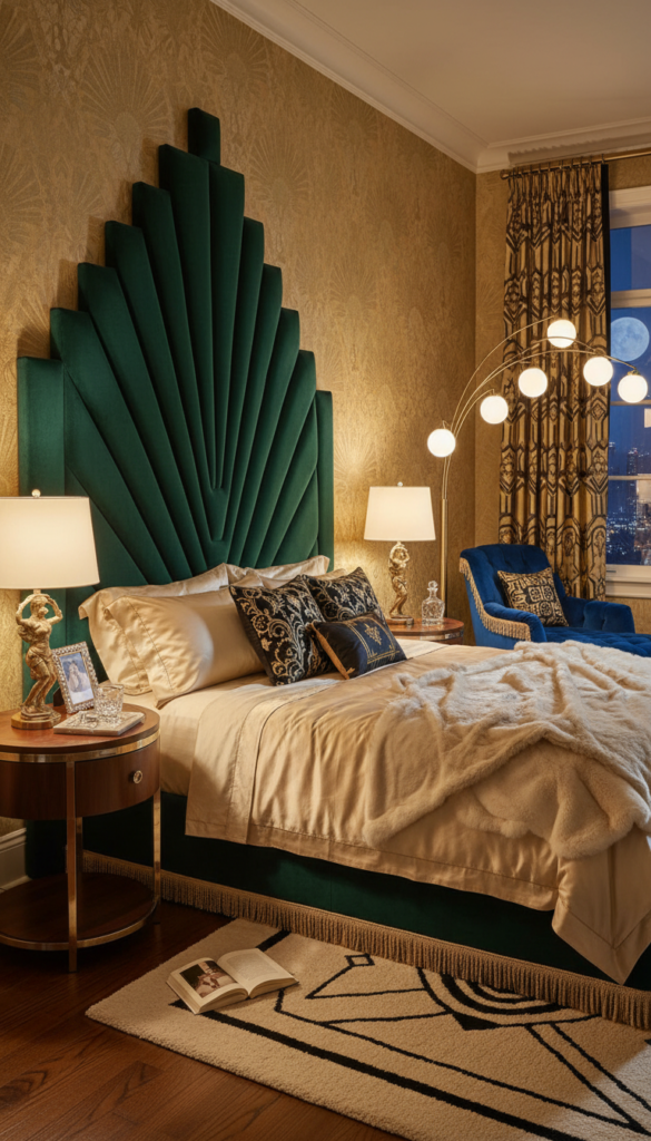 For a touch of 1920s Hollywood glam, a velvet headboard is essential. The texture captures light beautifully and adds a layer of sophistication and physical comfort for late-night reading.