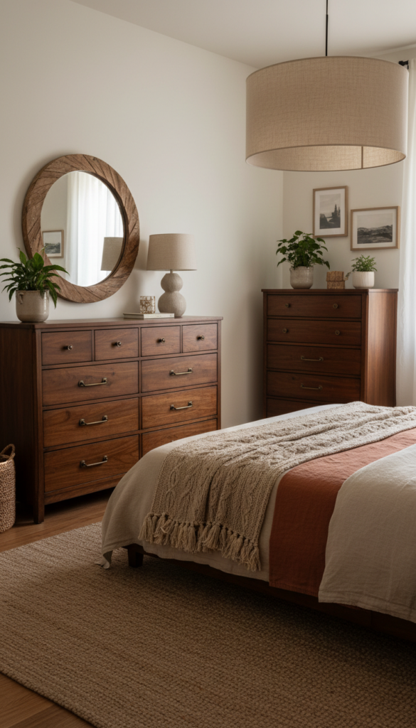 Natural wood brings warmth to a bedroom that painted furniture often lacks. A heavy, dark wood dresser with ornate detailing serves as a grounding piece that feels permanent and collected.