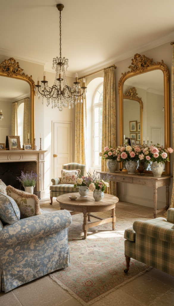 A gold-framed mirror is a staple of French Country decor. Whether hung on the wall or placed atop a vanity, it reflects light and makes the room feel larger and more opulent.
