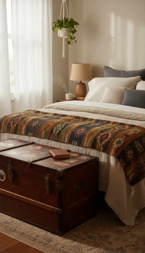 Before built-in closets were common, travelers used steamer trunks. Placing a trunk at the foot of the bed provides excellent storage for seasonal linens while adding a sense of adventure to the room.