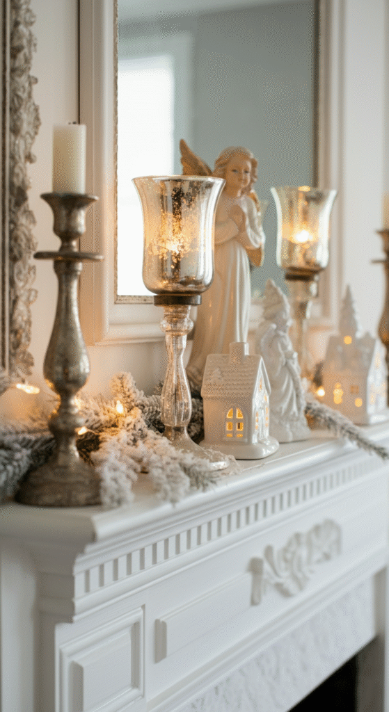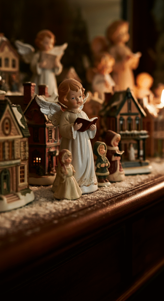 Place porcelain angels, miniature choirs, or old ceramic houses across the mantle. The key is not to overcrowd — space them out to let each figure breathe.