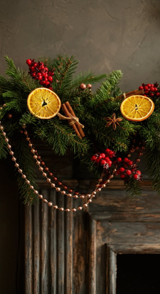 Start with natural evergreen garland. Add a second garland — something beaded, metallic, or slightly worn. Then weave in dried orange slices, cinnamon sticks, or old-style berries. This creates depth without feeling artificial.