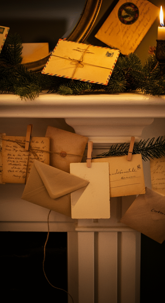 Line your mantle with old Christmas postcards, letters, or vintage-styled envelopes. You can place them behind garlands, tuck them between candles, or clip them onto twine for a layered story effect.