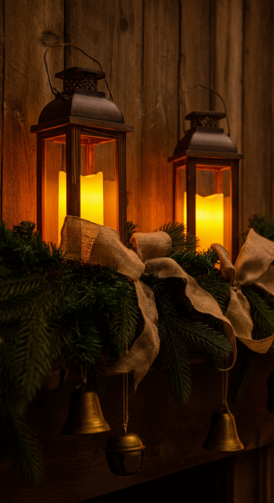 Place one or two rustic lanterns on either side of the mantle. Use warm LED candles inside to mimic real flames without risk.
