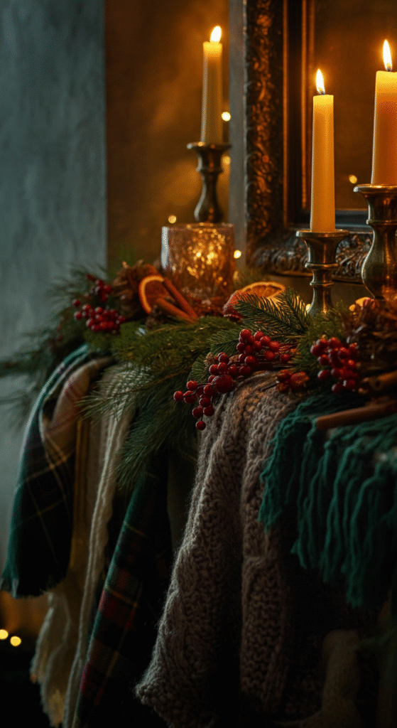 Add wool throws, plaid fabrics, and knitted pieces across the mantle space. You can drape a plaid scarf, cover the mantle with a textured runner, or add a folded wool cloth beneath candle holders and figurines.