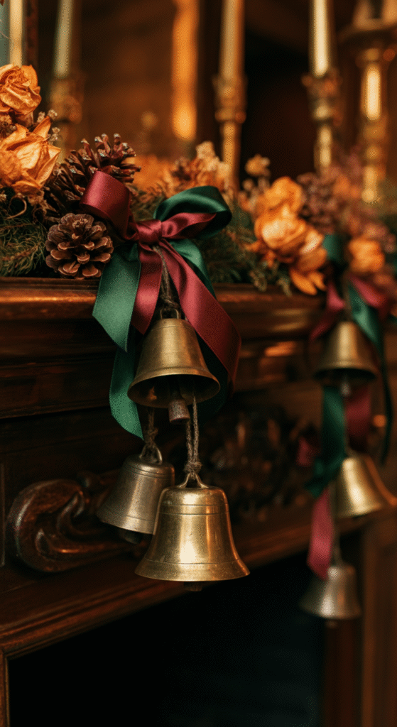 Hang brass or iron bells along your garland with deep-colored ribbons — think burgundy, forest green, or burnt gold. This instantly brings traditional European Christmas markets to mind.