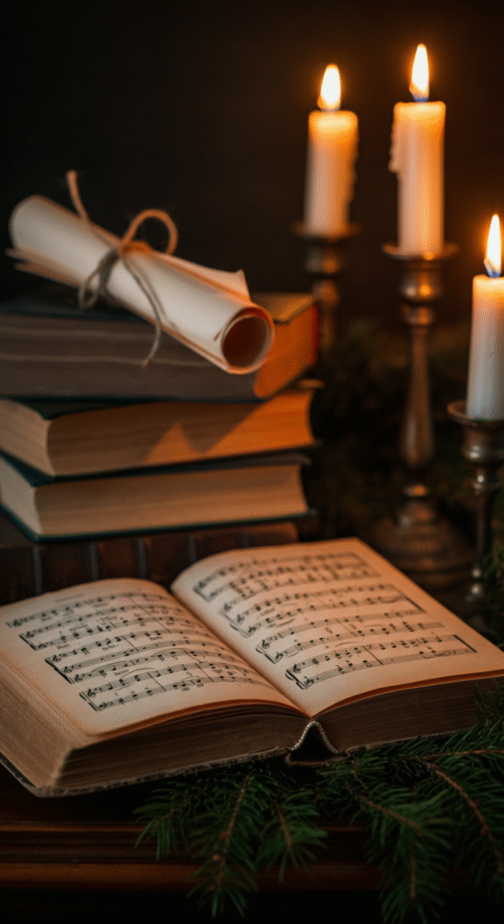 Stack vintage books on one side of the mantle. Open one book to display a hymn page or classic Christmas story. You can also roll sheet music and tie it with twine for a rustic touch.