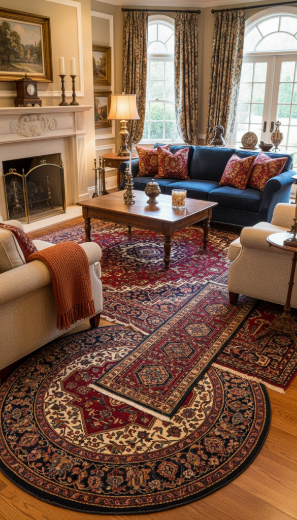 - Choose Oriental or Persian-style rugs with intricate borders.