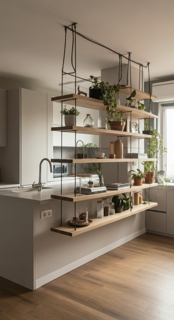 Interesting Fact: Floating shelves are not just for style—they also serve as a functional partition that allows light to pass through, making the space feel bigger and more open. They can be easily customized to suit the aesthetics of your home, whether you prefer a minimalist or more vibrant look.