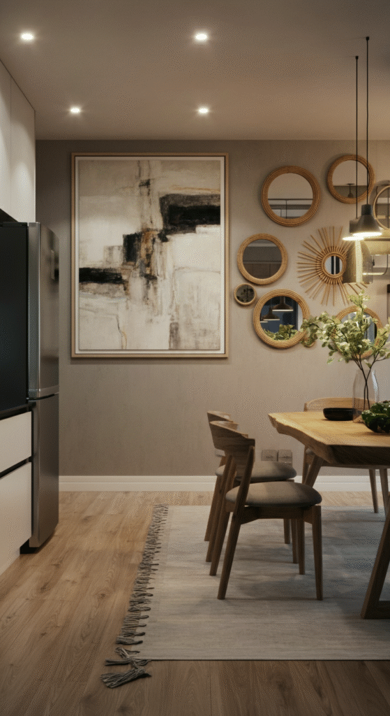 A focal wall made of artwork, mirrors, or wall décor can serve as a visual partition between your living room and kitchen.