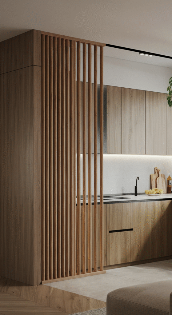 A multi-level partition works by incorporating varying heights of materials, such as wood, metal, or even plants, to create a dynamic, textured separation between your kitchen and living room. This design adds depth and visual interest, making the space feel more layered and multidimensional. It’s an ideal solution for those looking to introduce a unique and modern touch to their home.