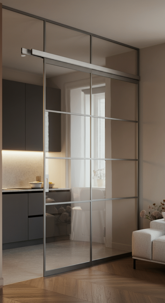 Sliding glass doors are an excellent option for modern homes. They provide a sleek, contemporary look while allowing for flexibility. When closed, they offer a clear partition between the kitchen and living room, and when open, they expand the space and create a seamless connection between the two areas. Glass doors also allow natural light to flow freely, helping your home feel more spacious.