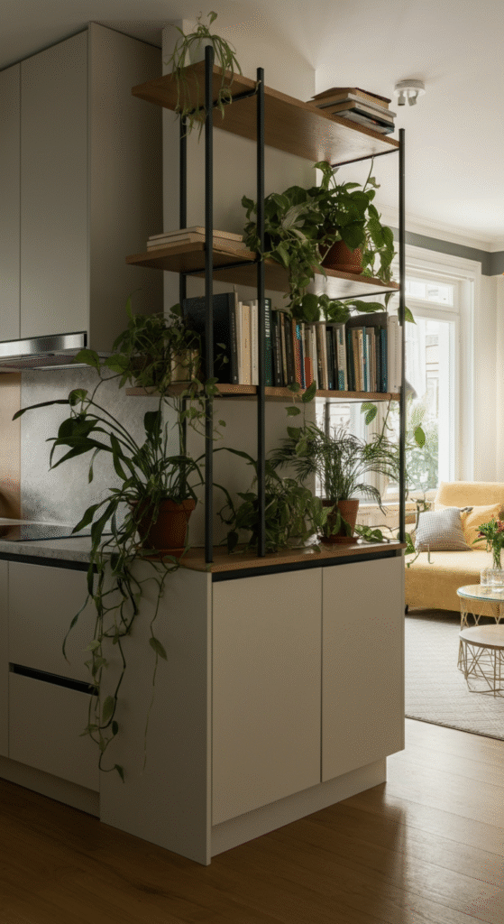 Open shelving units are another fantastic way to partition the living room and kitchen while keeping both areas accessible. These shelves can be used to display decorative items, kitchen essentials, or even plants, adding character and texture to your design.