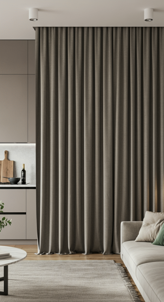Curtains or drapes are one of the easiest and most affordable options for partitioning a living room and kitchen. They can be installed along a track system or attached to the ceiling, allowing you to pull them open or close whenever you need privacy. This gives you full control over how much separation you want between the two spaces.