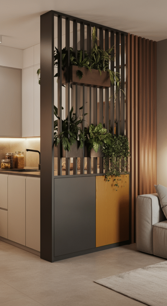 In small apartments, the key to effective partitioning is using elements that don’t take up too much space while still providing a visual or physical boundary. Options like floating shelves, tall potted plants, or curtains are ideal for small spaces as they are lightweight and flexible. These solutions help maintain an open feel while offering some level of separation between the two areas.