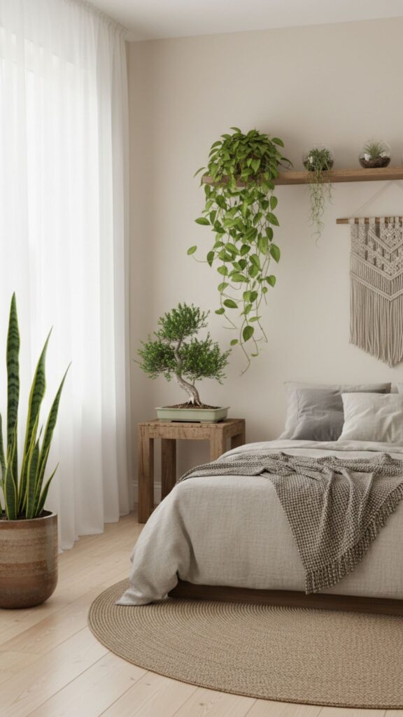 Plants that have simple, structural leaves work best. Snake plants, bamboo, bonsai trees, and peace lilies are popular choices because they look sculptural and are known for their air-purifying qualities.