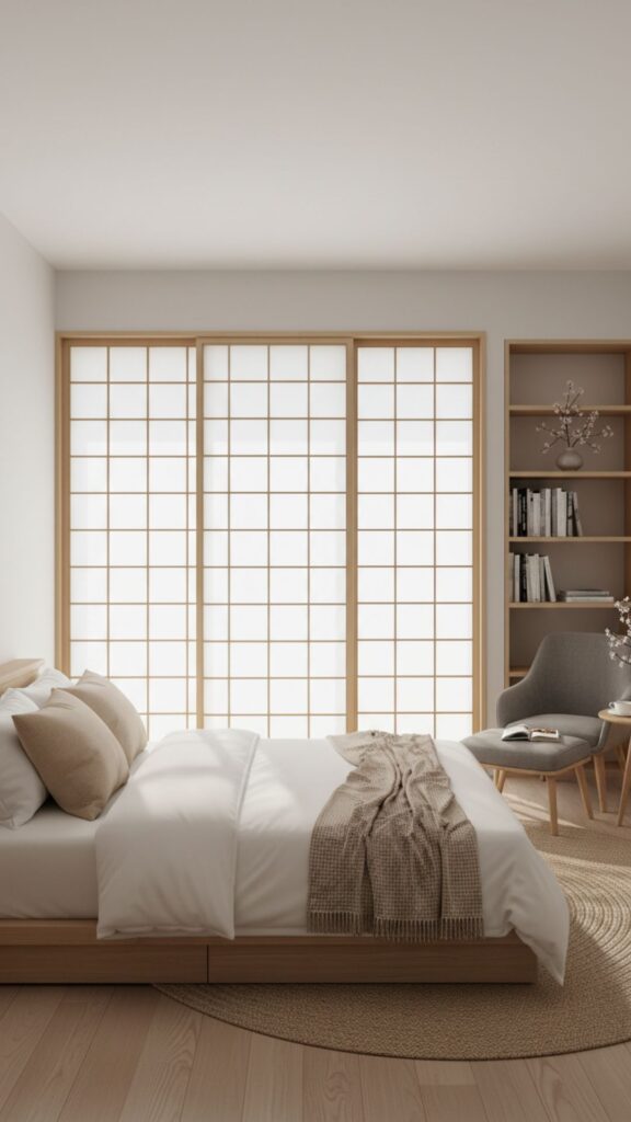 If you have a larger bedroom or a studio apartment, creating distinct zones without building walls is essential. Shoji screens—traditional Japanese room dividers made of translucent paper and wood—offer privacy while still allowing light to filter through gently.