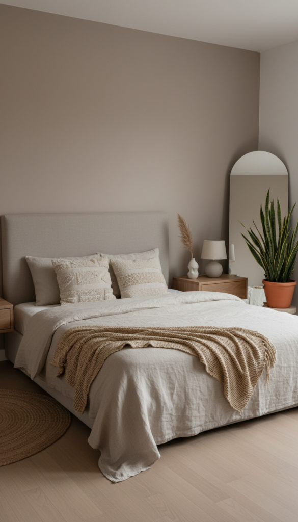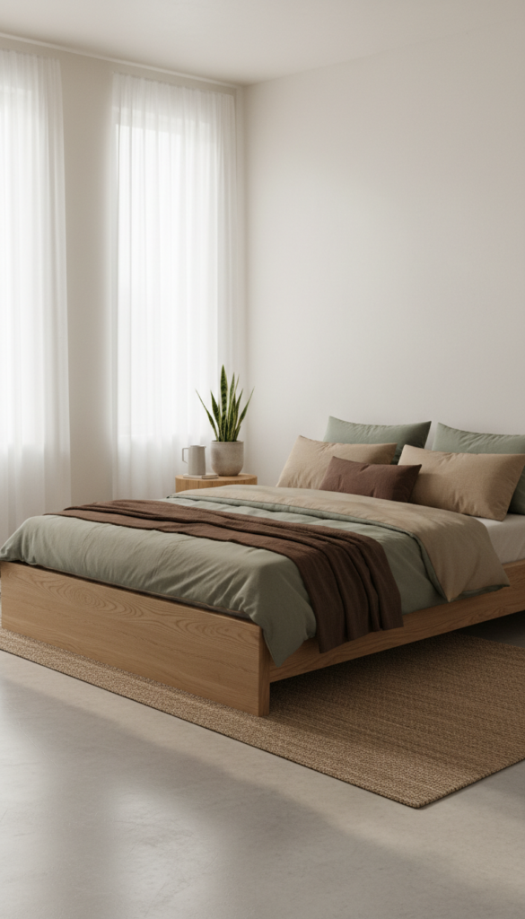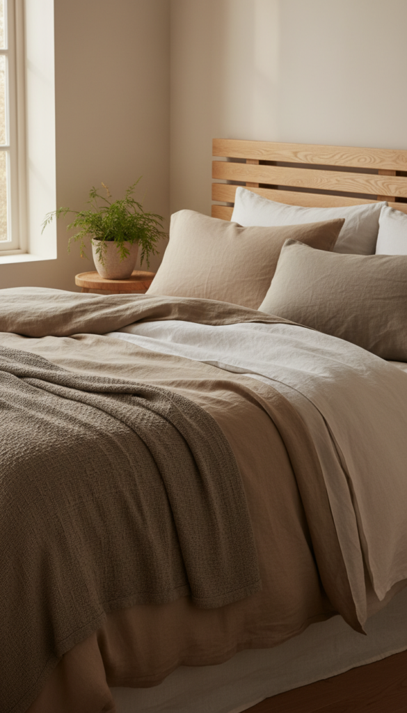 Earth tone layering works best when textures change, not colors. For example, a woven throw over smooth linen sheets creates visual interest without visual noise.