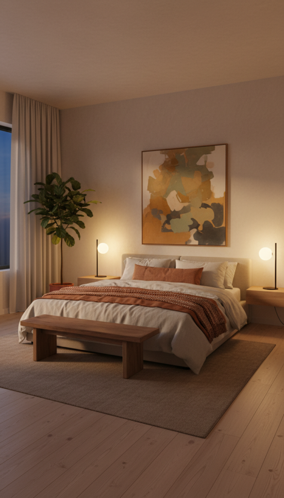 Use warm white or soft yellow lighting through bedside lamps, wall sconces, or floor lamps.