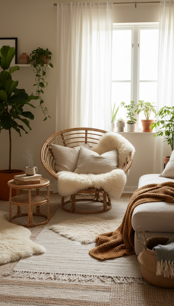 - Layer rugs and throw blankets for texture.