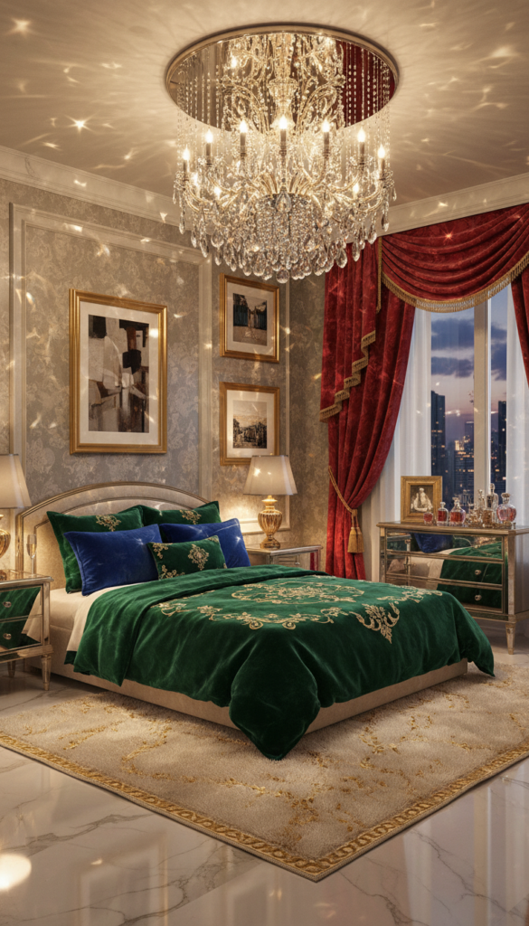 Glam is all about luxury, sparkle, and making a statement. It uses rich fabrics like velvet and shiny accents like gold or crystal.