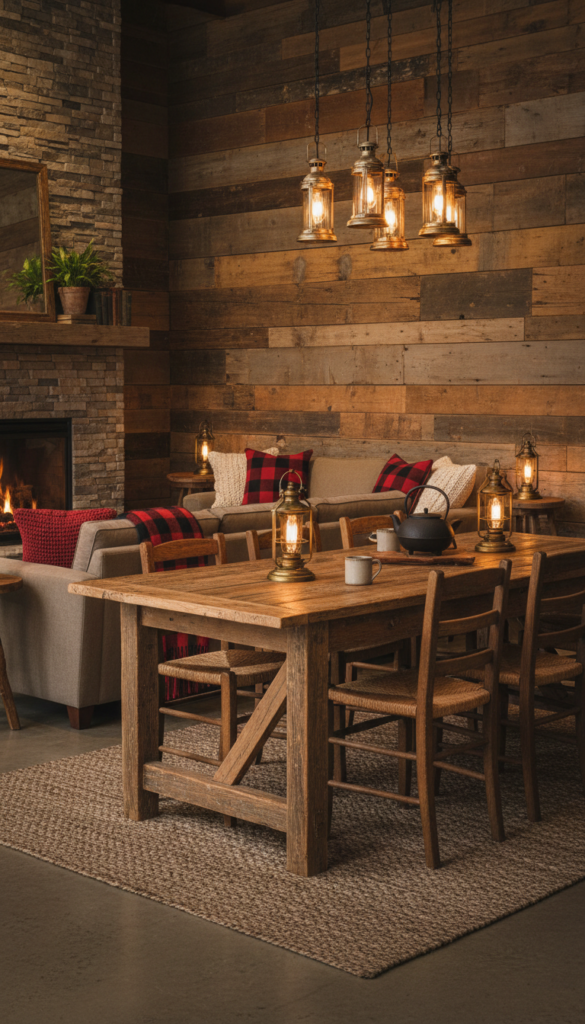 Warm and inviting, the rustic aesthetic focuses on raw materials. It feels grounded, utilizing distressed wood and cozy plaid patterns.