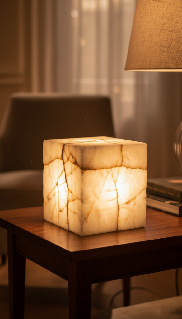 Heavy, solid materials like marble, travertine, or alabaster ground a room. These lamps feel substantial and expensive. Alabaster, in particular, is translucent, meaning the base itself glows when the light is turned on, creating a magical, ethereal effect.