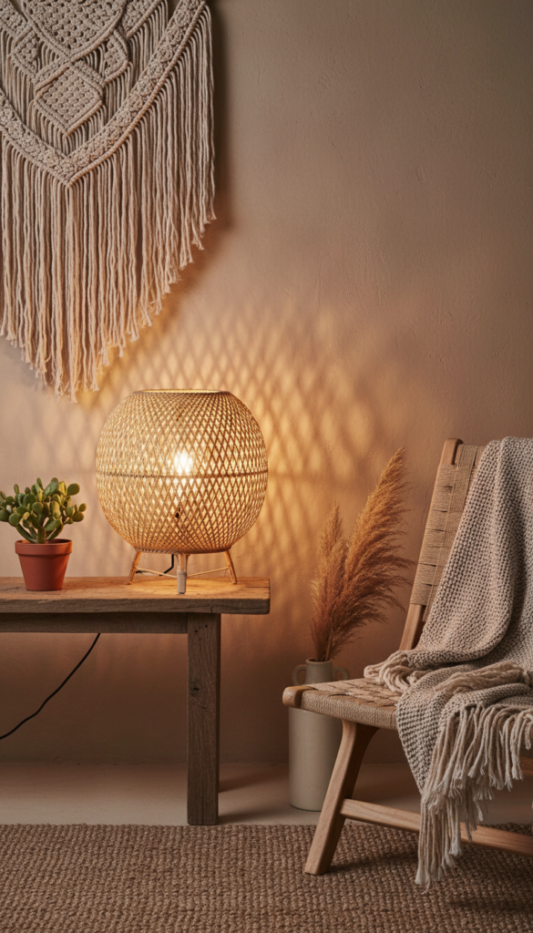 To introduce warmth and texture, opt for a lamp with a rattan or wicker shade. When lit, the woven material casts beautiful, intricate shadows across the walls, adding depth to the room. This style pairs perfectly with neutral bedding and lush indoor plants for a boho-modern feel.