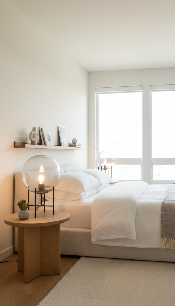 If your bedroom is small, visual weight matters. Clear glass lamps are an excellent hack because they take up less visual space, making the nightstand appear less cluttered. Whether it’s a clear glass base or a transparent globe shade, these lamps feel airy, light, and effortlessly chic.