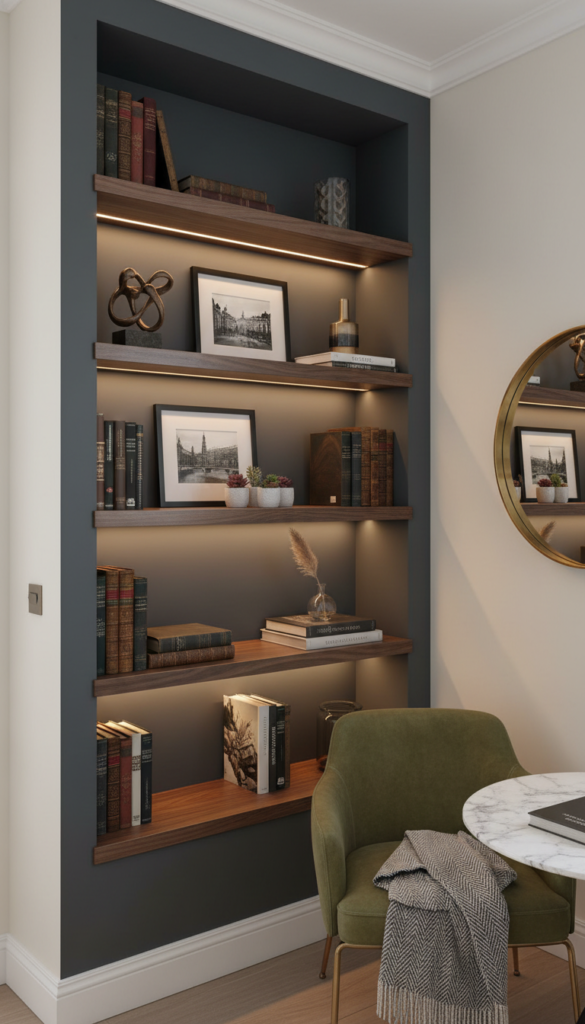 If you have awkward alcoves or recessed walls, fit custom-width floating shelves into the gap. This mimics the look of expensive built-ins and turns a weird architectural quirk into a deliberate design feature.