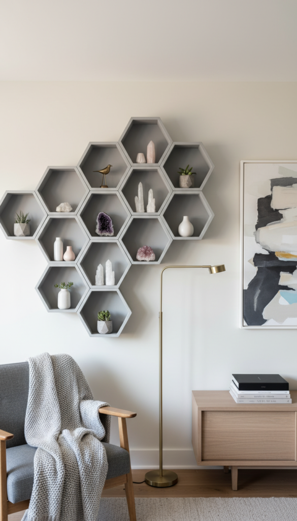 For a touch of geometric modernism, honeycomb shelves are a fun choice. They act as wall art in themselves and are perfect for highlighting small, precious trinkets or crystals.