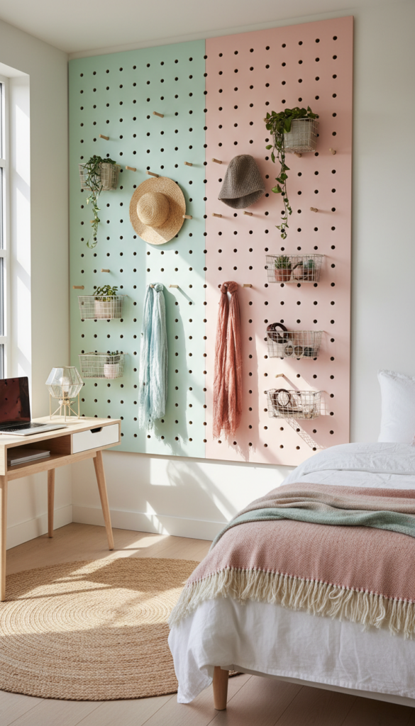 Pegboards aren’t just for garages. In a small bedroom, they offer incredibly versatile vertical storage. You can add shelves, hooks, and baskets to the board, customizing the layout to fit your specific needs.