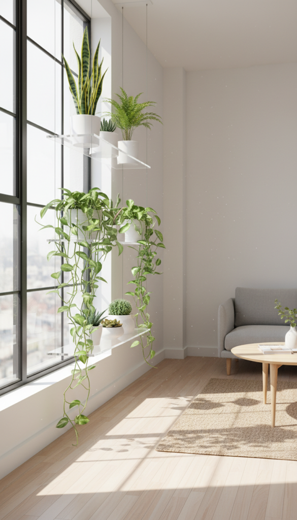 If you are a plant parent with limited sill space, installing glass or acrylic shelves across your window is a game-changer. This allows you to stack plants vertically, giving them all the sunlight they crave without cluttering the floor.