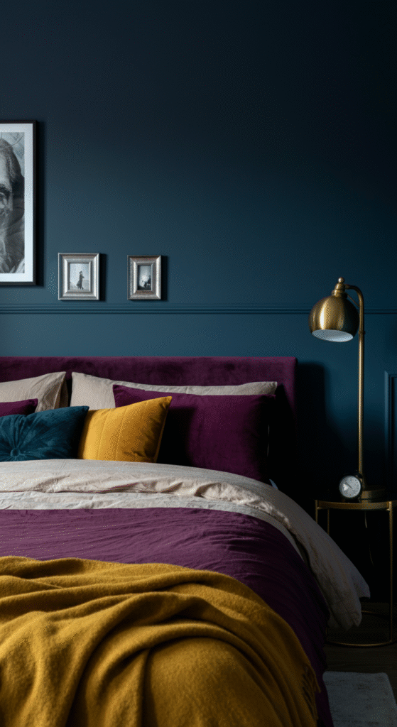 To enhance this look, add metallic finishes in gold or silver through light fixtures or decorative accessories. These accents elevate the bold colors and create a sense of luxury.