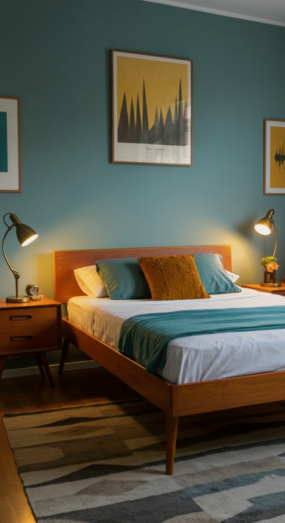A mid-century modern bedroom often features a wooden bed frame with simple, straight lines, paired with bold accent colors like teal or mustard yellow. Add a retro-inspired lamp or an abstract print on the wall for that perfect finishing touch.