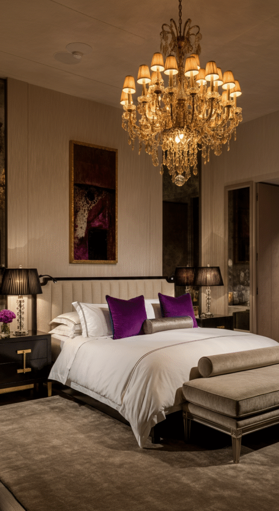 Add plush bedding, high-quality furniture, statement lighting, and metallic accents like gold or silver to give your bedroom a luxurious hotel-inspired feel.