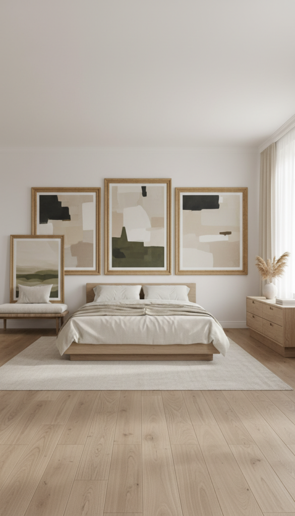 Artwork fills visual gaps in large bedrooms.