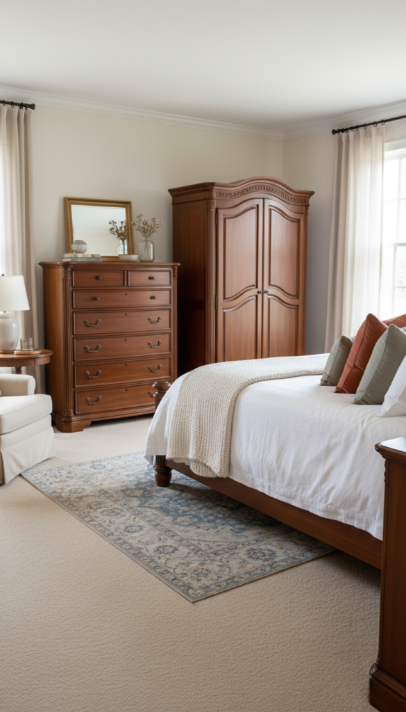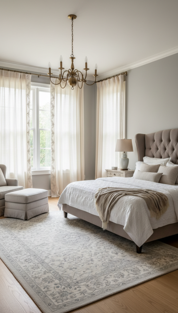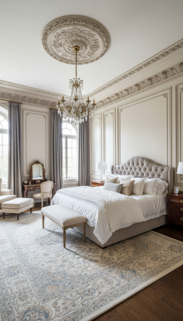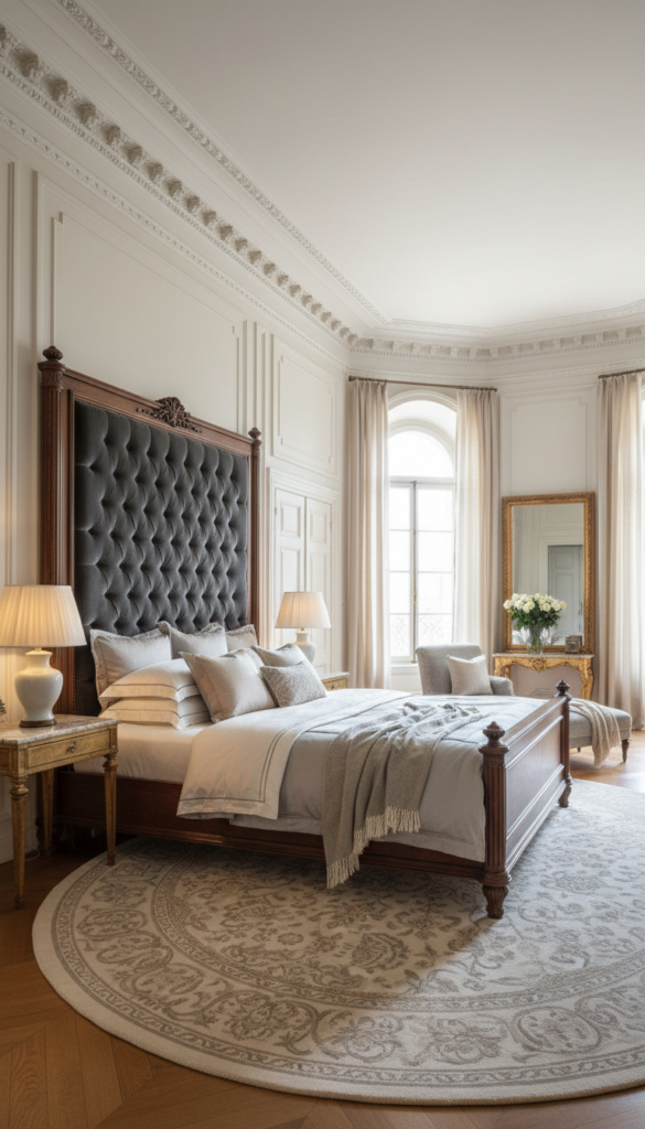 Classic homes benefit from upholstered headboards, carved wood frames, or tall poster beds.