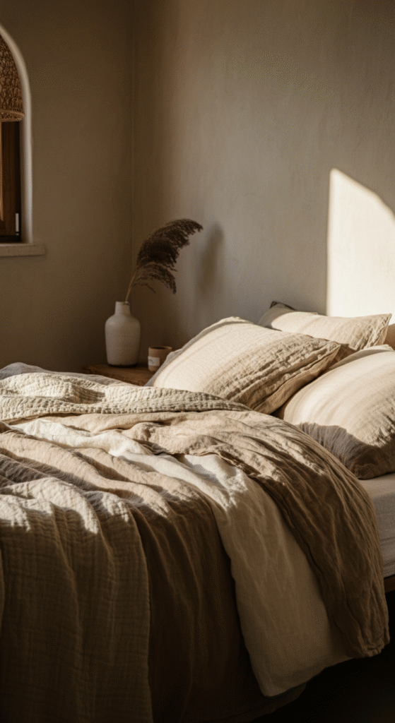 Start with a neutral foundation like off-white, sand, or soft beige bedding. On top of that, introduce subtle variations such as oatmeal, clay, or muted taupe. These shades sit close together on the color spectrum, which creates visual calm instead of contrast.