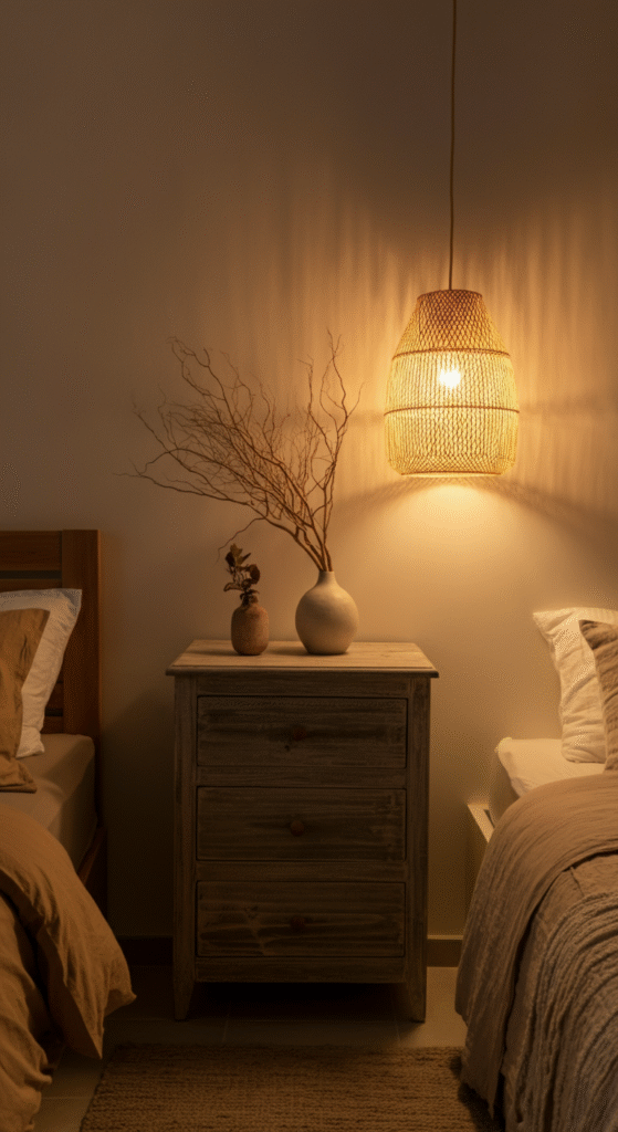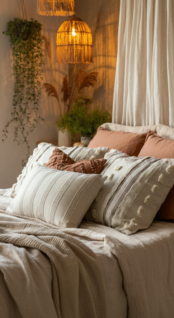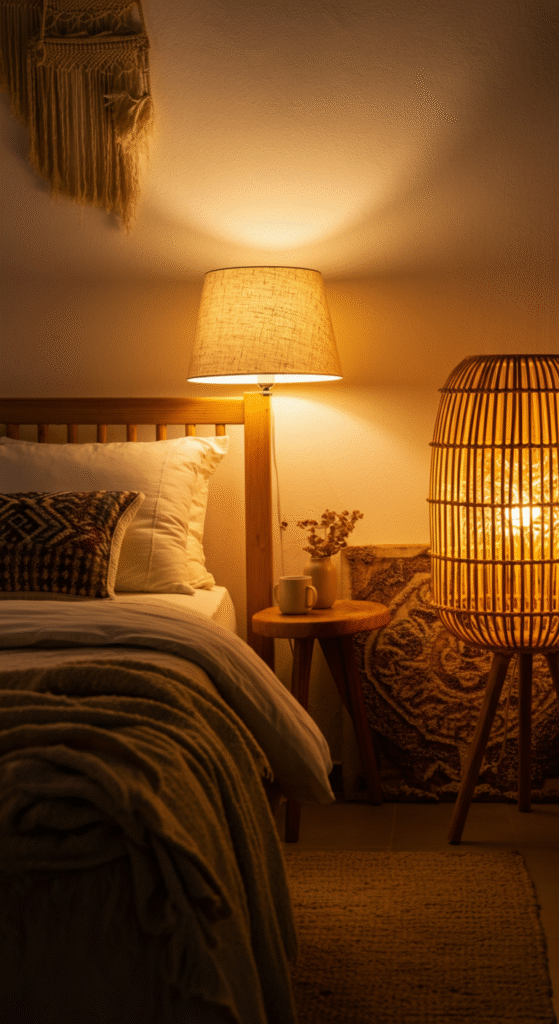 Instead of relying on a single overhead light, warm boho bedrooms use multiple light sources. A linen-shaded lamp on each bedside table creates balance, while a woven floor lamp in the corner adds depth.
