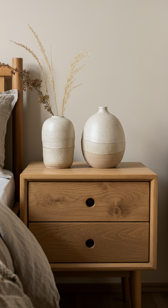 Placing a ceramic vase on a bedside table or dresser instantly introduces an artisanal feel. Even when left empty, these pieces act as sculptural elements that soften the room.