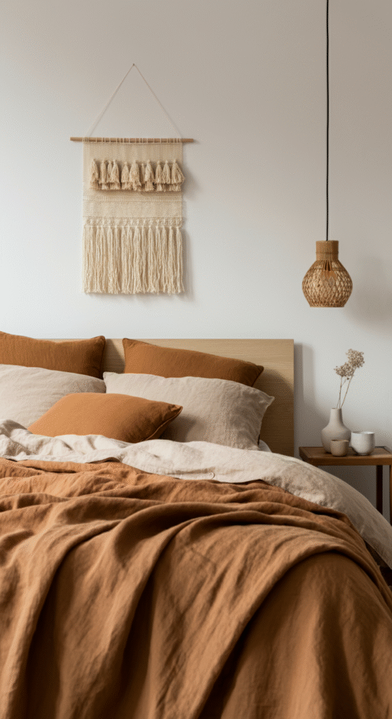 Using these colors on the bed creates a visual anchor for the room. A muted rust duvet or warm brown quilt instantly shifts the atmosphere from minimal to soulful. Pairing earth tones with lighter neutrals keeps the room from feeling heavy.