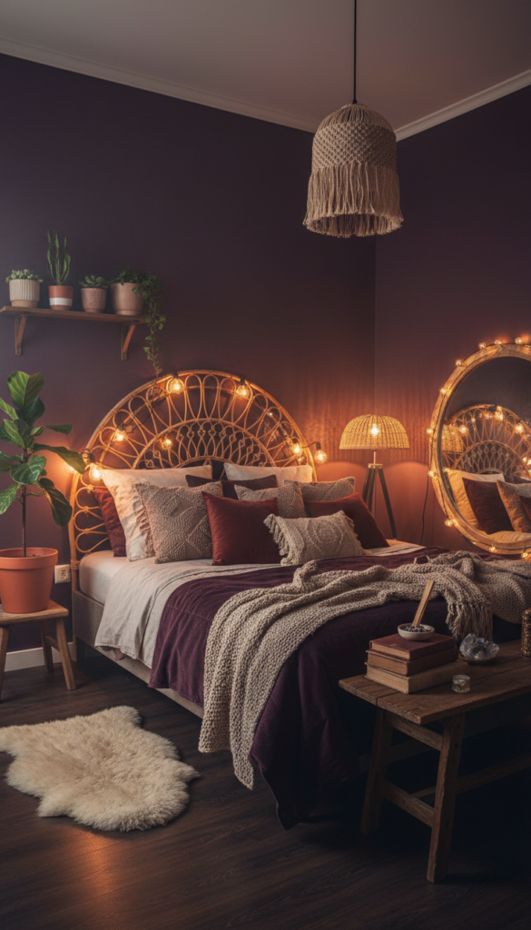 For a moodier vibe, contrast deep plum walls or bedding with the golden warmth of rattan furniture. This combination feels earthy yet sophisticated.