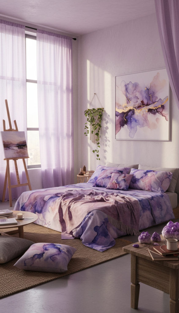 - Choose tie-dye or watercolor purple pillowcases.