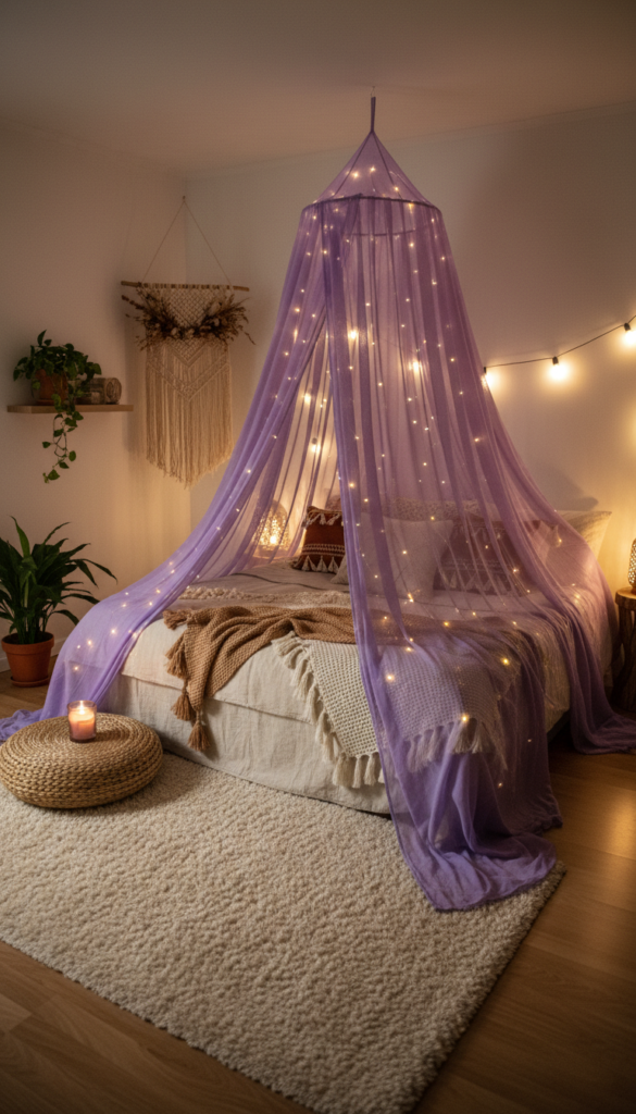 Nothing says boho romance like a canopy bed. Using sheer purple fabric creates a private, ethereal cocoon.