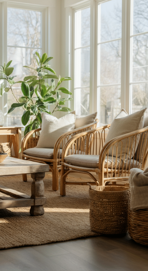 Tip: Choose one large natural piece (like a rattan lounge chair) and complement it with smaller ones (woven baskets, wood trays) so the feel is cohesive but not cluttered.