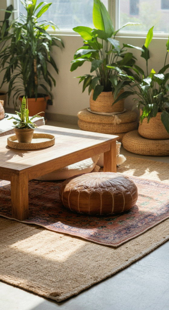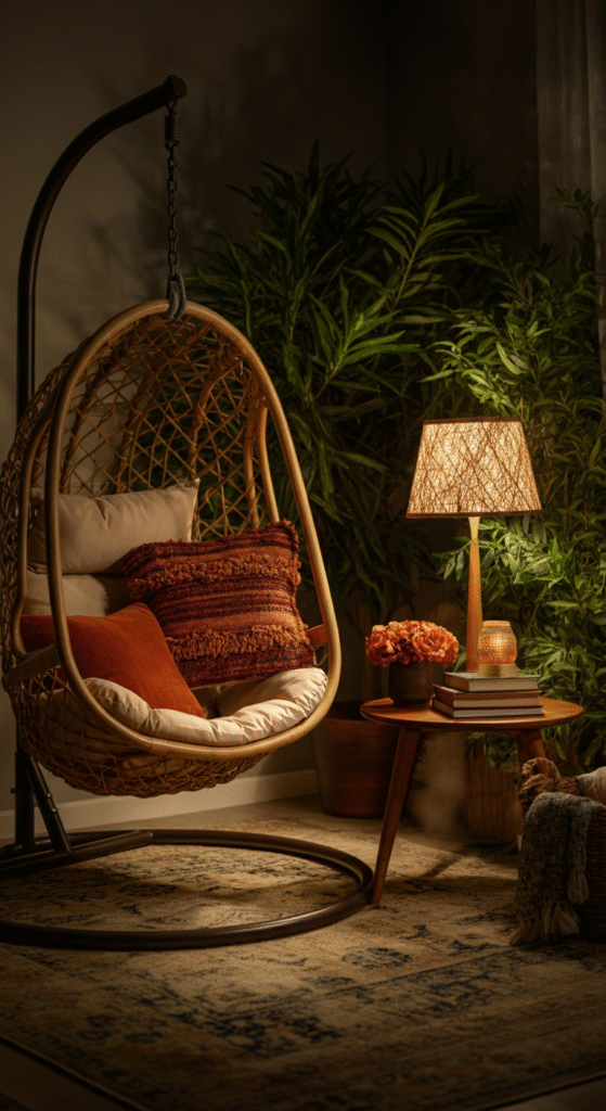 Tip: If space allows, place a rattan hanging chair in a corner with a floor lamp and side table. Or scatter floor cushions and a low coffee table. Use a small rug to anchor the nook distinct from the main seating area.