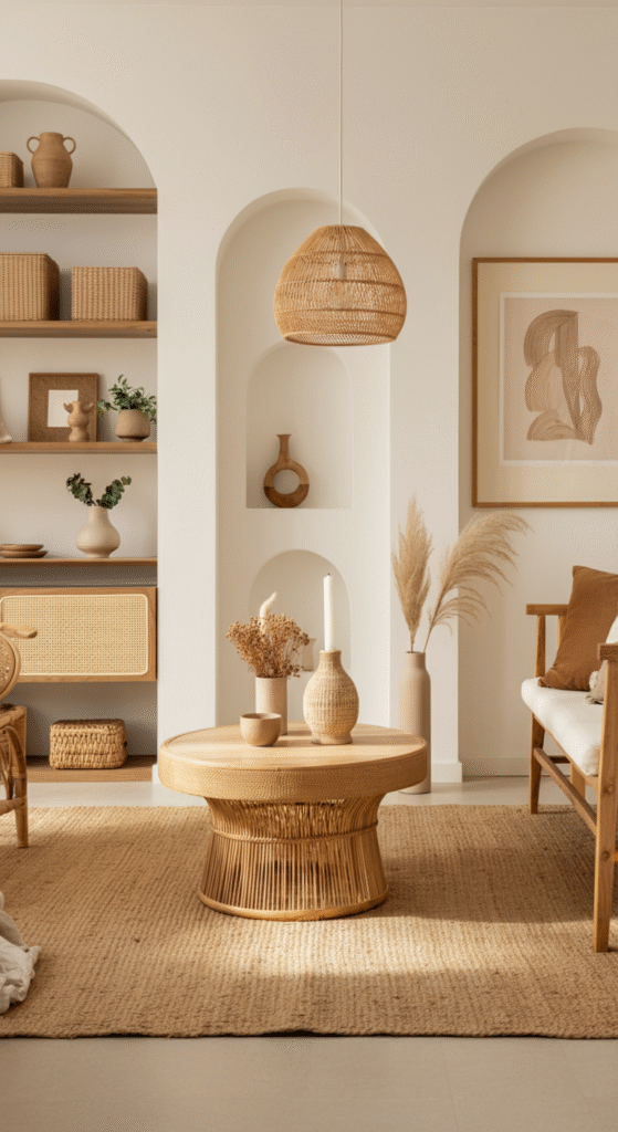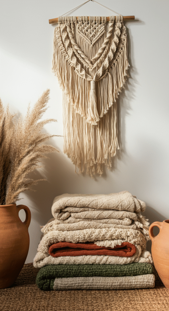Think macramé art, woven rugs, indoor plants, handcrafted pottery, and cozy throws — all in a cohesive palette of earthy tones.